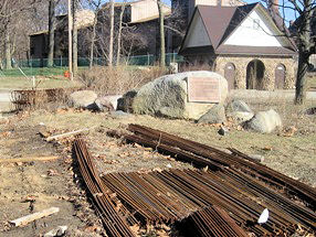 It sounds like a nicely executed tribute to the city’s namesake. The problem is that the monument seems to have been forgotten by the city. Not only is there garbage and knee-high weeds all around it, but the construction crew for the aforementioned expansion is using the space around the monument as a holding ground for piles of metal and other construction materials.