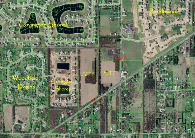 There are two parcels for sale near Elm Road and State Road 23. A 39.25 acre parcel, listed for 7.5 million dollars, is located at the northwest corner of the intersection. The second, with 20 acres available for 4.5 million dollars, is adjacent to Covington Shores itself. An aerial view helps make the orientation of the lots more comprehensible, and helps you visualize how commercialization would impact the neighborhood.