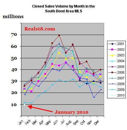 The 121 sales added up to $9.6 million in volume. That is the lowest monthly sales volume going back as far as the South Bend MLS provides electronic records, mid 2001. It is also the first time the sales volume has fallen below $10 million.