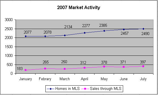 Compared to 2005 and 2006, unit sales reported through the MLS are still down 22% for the year. The July numbers were hopeful, but it may be that the sharp reduction in June was carried over some sales into July which made July look better since June was awful when compared to 2005 and 2006. I think we’ll have to wait for the August and September numbers to really see if the market is picking back up. I continue to believe that the first half of 2008 will be a buyer’s market with that probably continuing through the rest of 2008. Without an interest rate cut, inventories will continue to be high.