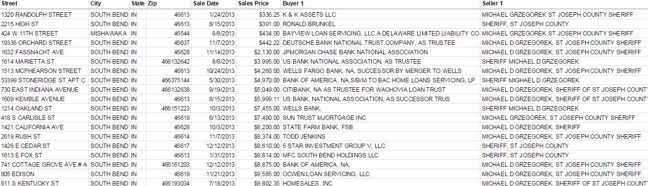 Indiana is a public disclosure state for sales prices, so it’s possible to recreate much of this data. Skipping through the details, by identifying 75+ variants of “St. Joseph County Sheriff” as the seller, I’ve compiled specifics on almost 5,000 foreclosures. While that’s not comprehensive, it’s a “good enough” to way to further investigate them as a group.