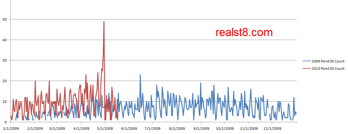 Personally and based upon my own conversations with people whose workflow is determined by the number of real estate transactions they touch (other real estate agents, title company closers, property inspectors and mortgage brokers), the tax credit increased the number of sales. But since I can’t talk to everyone involved with every sale, I checked the statistics too…the graph below charts the number of properties listed for sale in the South Bend Area MLS that went under contract each day in 2009 and through May 17th , 2010.